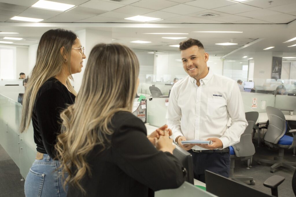 Yerko Andrés Arce Alvial conversa con colegas en la sede central de Komatsu Cummins Chile, en Santiago. “La Fundación Reinventarse puede generar un cambio en las personas, como lo hizo conmigo.”