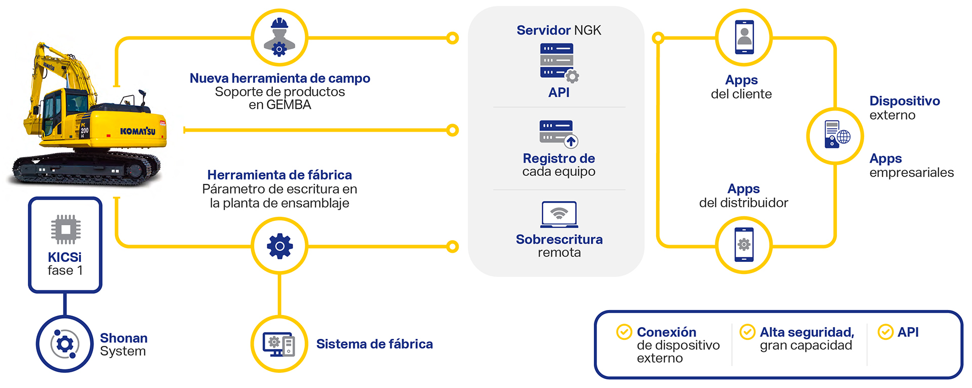 Una de las grandes diferencias con el actual servidor Komtrax es que el servidor NGK se puede conectar a un dispositivo externo. Además, se ha actualizado su capacidad, por lo que se pueden manejar datos de alta frecuencia y más detallados a solicitud del cliente o el distribuidor. No solo pueden utilizar los datos a través de Komtrax de KLTD; el cliente y el distribuidor pueden crear su propia aplicación a través de la API de KLTD (una API es un conjunto de códigos de programación que permite que las aplicaciones se comuniquen entre sí).
