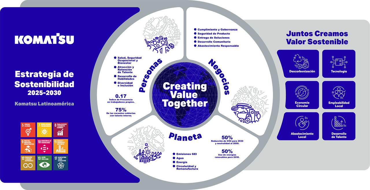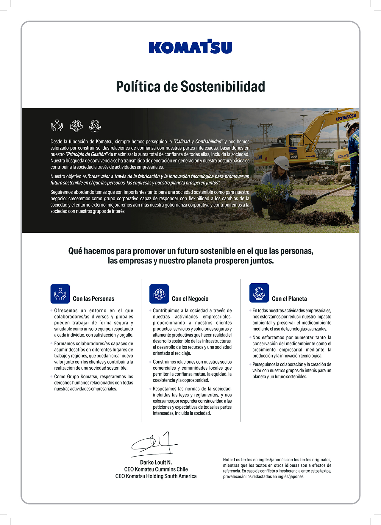 La sostenibilidad es el eje que conecta el propósito de Komatsu con nuestro quehacer diario, para asegurar que las personas, el negocio y nuestro planeta prosperen juntos. Nuestra Política de Sostenibilidad Global orienta la gestión de nuestros riesgos e impactos no financieros y nos permite ser aliados estratégicos de nuestros clientes, contribuyendo a los desafíos más críticos de las industrias donde tenemos presencia.
