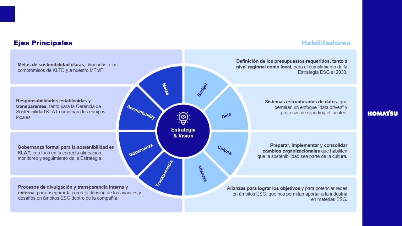 Promovemos un futuro sostenible en el que todos prosperemos juntos. El año 2021 se publicó nuestra Política de Sostenibilidad Global basada en tres pilares –personas, negocio y planeta– que busca hacer de esa promesa una realidad. Esta norma aborda temas relevantes para Komatsu Latinoamérica con especial foco en la gestión de nuestros riesgos e impactos no financieros, lo que nos permite responder con flexibilidad a los cambios sociales y del entorno, materializando nuestro principio de gestión, donde el valor corporativo es la suma de la confianza que nos entregan nuestros diversos grupos de interés.